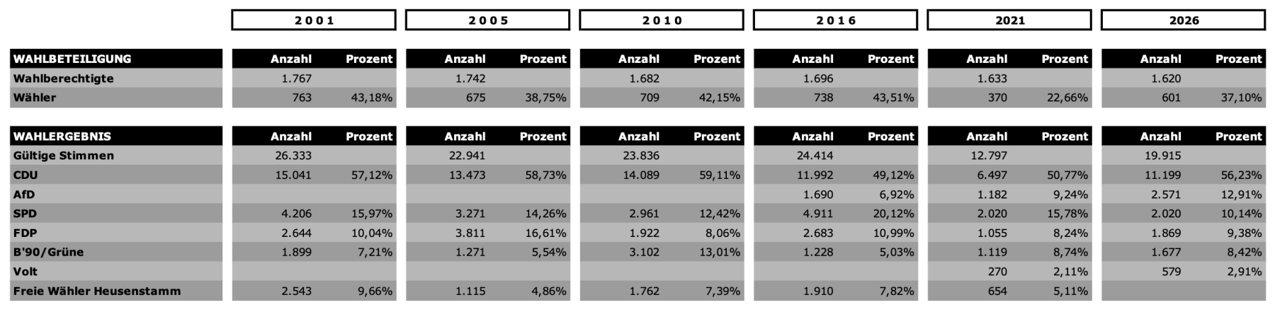 Anmerkung: Die hohe Zahl an Stimmen resultiert aus dem im hessischen Kommunalwahlrecht verankerten Wahlverfahren mit den Möglichkeiten des Kumulieren und Panaschierens. Die vermeintlich niedrige Wahlbeteiligung resultiert aus der sehr hohen Zahl an Briefwählern, die nicht den jeweiligen Wahlbezirken zugeordnet werden können. Insofern ist die Aussagekraft der Zahlen eingeschränkt.